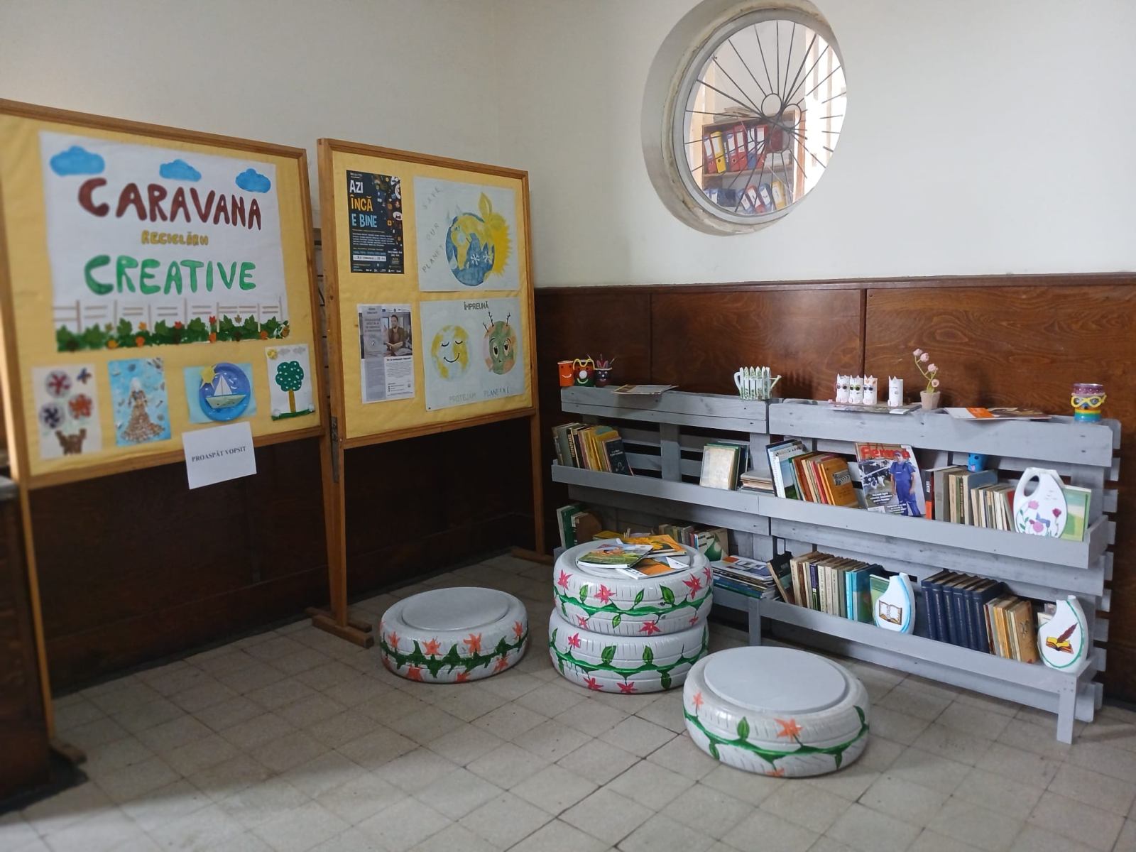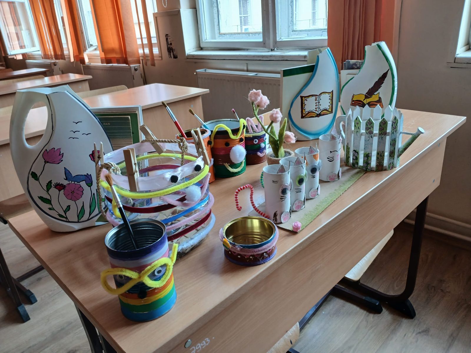 • Zona „Reciclate și-napoi la lume date”: Deșeurile textile, platice și metalice au fost transformate în ghivece și suporturi utile pentru școală.