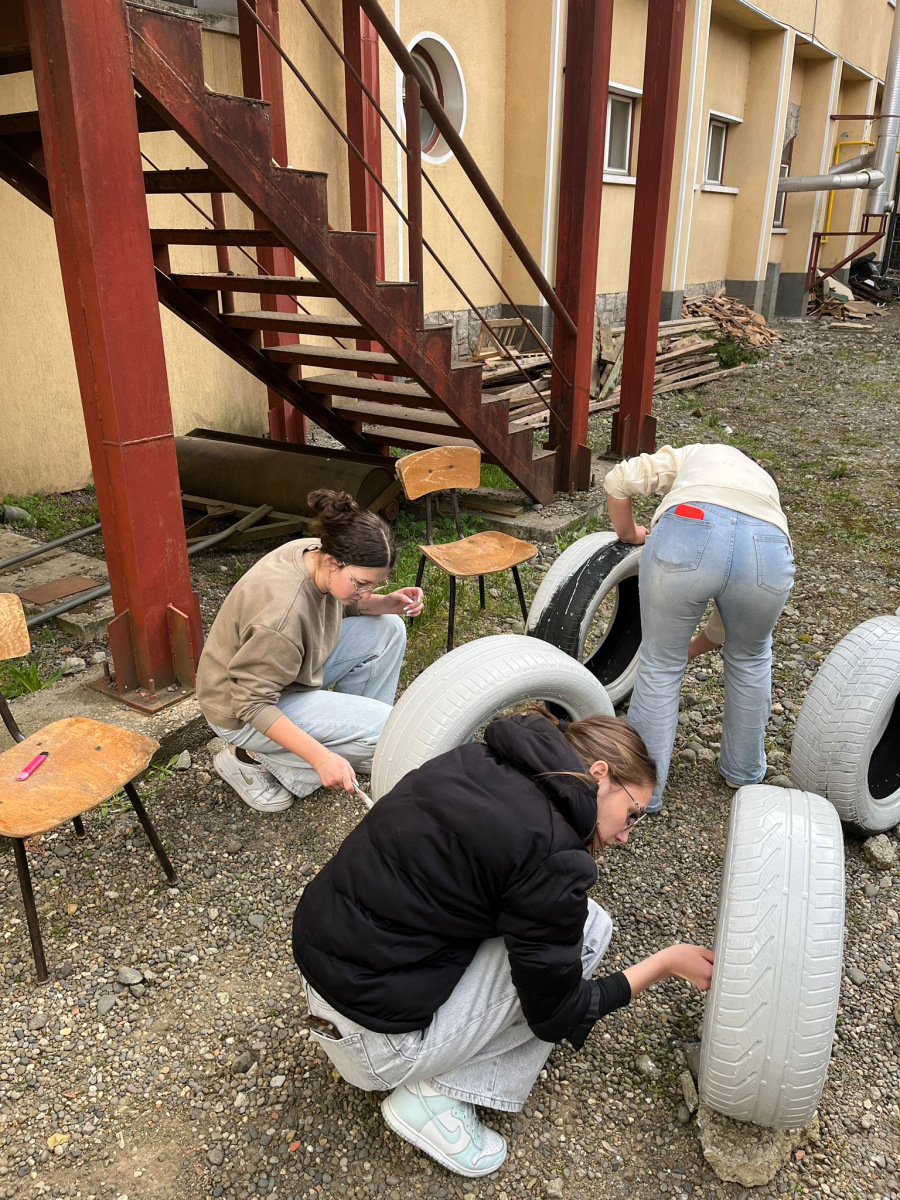 • Zona „Lecturi Inspirate”: Am creat un spațiu de relaxare cu mobilier inedit, construit din paleți și anvelope uzate.